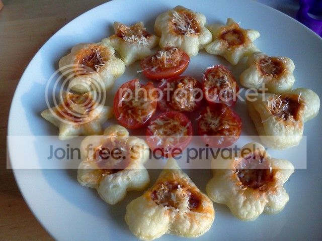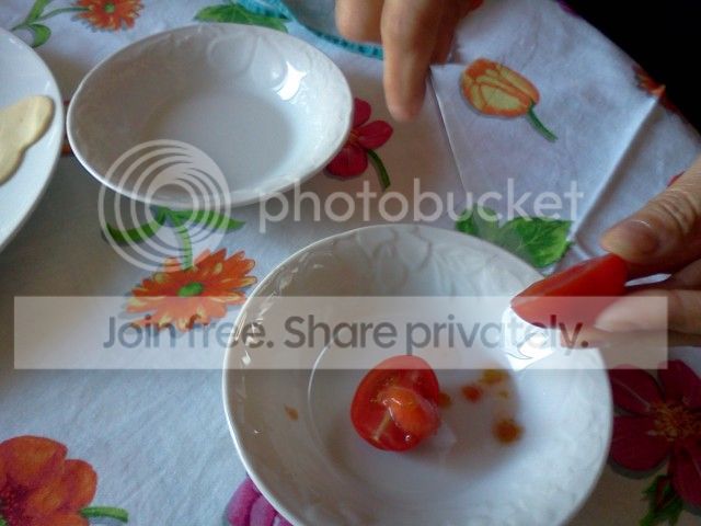 Mentre la pasta sfoglia è in forno tagliate a metà i pomodorini precedentemente lavati ed asciugati. Svuotateli e disponeteli su un piatto.
