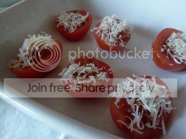 Grattugiate il formaggio e spolveratelo sopra ai pomodorini già riempiti.