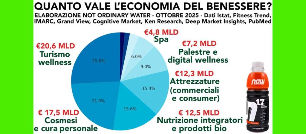 Secondo l’analisi di Not Ordinary Water basata su dati Istat, Fitness Trend, IMARC Group, Grand View Research, Cognitive Market Research, Ken Research, Deep Market Insights e PubMed (Health and fitness trends in Southern Europe), sul podio di questo comparto troviamo turismo, cosmesi e nutrizione.